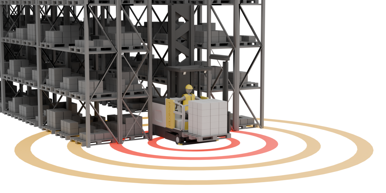 ELOprotect Ranger uses laser sensors in the aisle. It automatically switches to use UWB wireless technology out of the aisle, i.e. when VNA trucks are free ranging. UWB enables out-of-aisle truck-to-truck and truck-to-pedestrian collision avoidance.